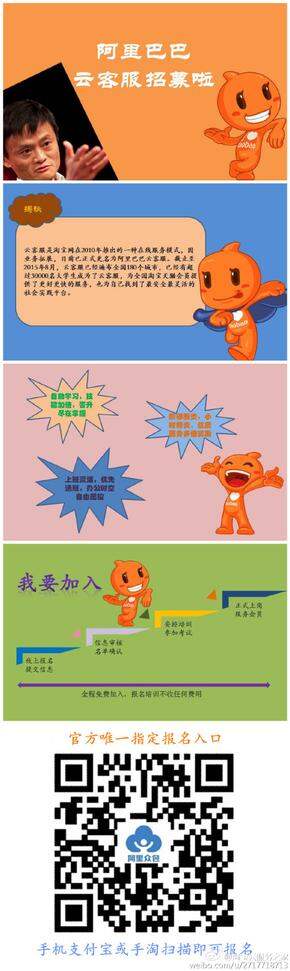大学生想做兼职的看过来。有对淘宝官方云客服感兴趣??只招在校大学生哦。给马云做客服!!!不是给那些店铺卖家哈!!!方式如下。时不时开放招一批,可以微博关注“淘宝云服务之家”