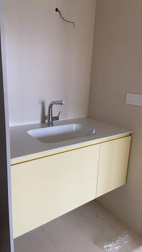 好喜欢我的小鸡黄浴室柜,超级满意,还有强烈安利三荣水龙头本地工厂所以便宜一点,一个岩板无缝拼接一米零几的尺寸光浴室柜1800,还有一个哑光陶瓷一体盆1米的切割了一下也是1800店铺:🍑极光高端定制卫浴