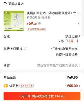 买25-5全品券https://u.jd.com/2O5lPdF 觅橘护颈防晒口罩+冰袖京东购物小程序下单14.9亓https://u.jd.com/215lvaS
