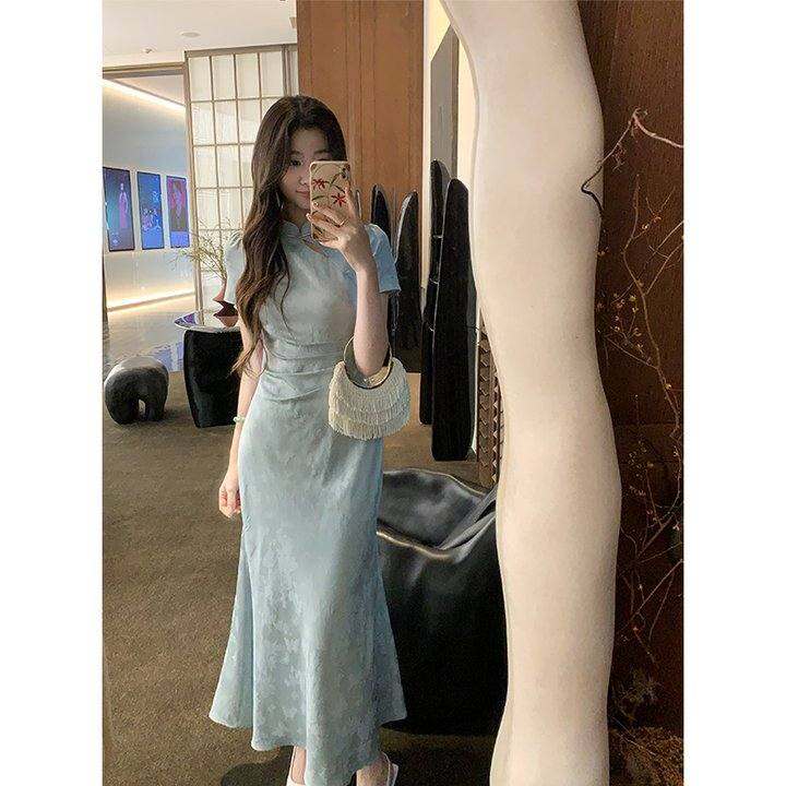 新中式复古EIA一尧【云蓝序】改良旗袍女夏季暗纹提花短袖连衣裙
