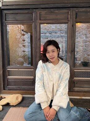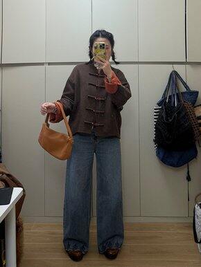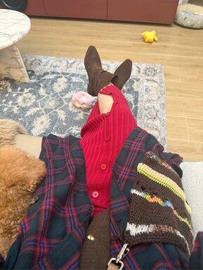 体重上升到119斤了,好多裙子都穿不下,现在基本都穿裤子,所以这件也搭了裤子。其实搭丝绒裙应该也好看的。