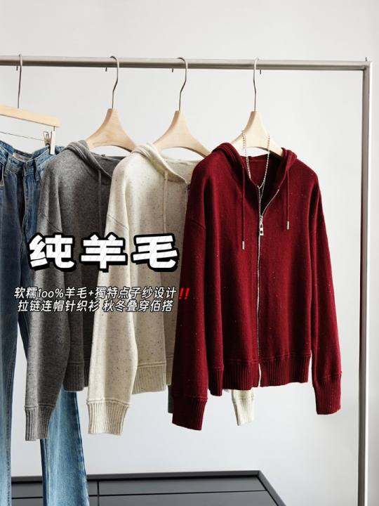 现货告别5折 点子纱工艺荃羊毛 休闲连帽5色针织开衫女<HXNS079