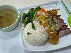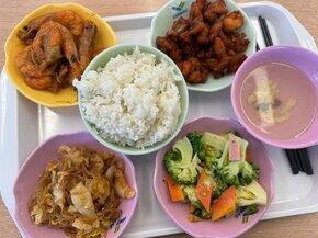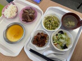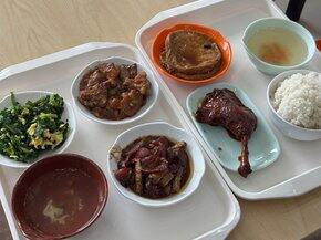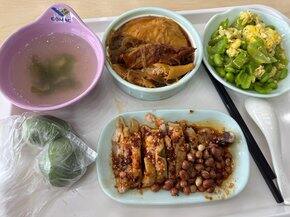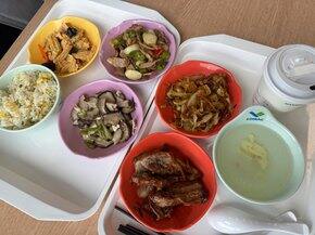 午餐食堂这两杯居然是一模一样的 都是普洱…只差一袋卡美罗糖但我还是很喜欢觉得很好喝的晚餐 菜菜和肉肉们今天练背有氧半小时