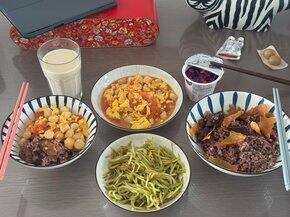 午餐食堂晚餐一根玉米回家又整一顿 酸奶燕麦 炒菜米饭今天练臀