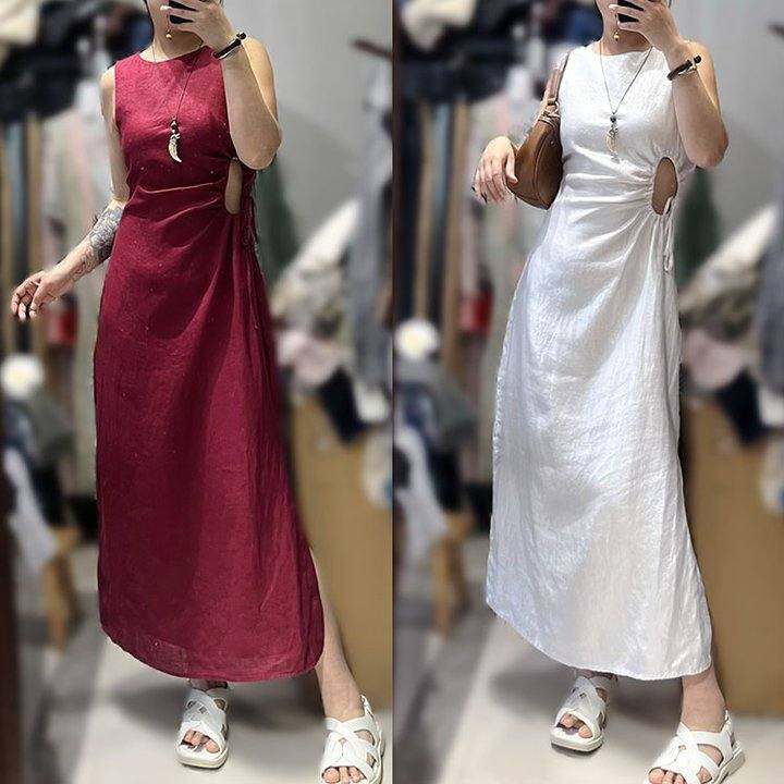 出口原单100%进口水洗亚麻复古优雅气质显瘦开衩珍珠白中长连衣裙