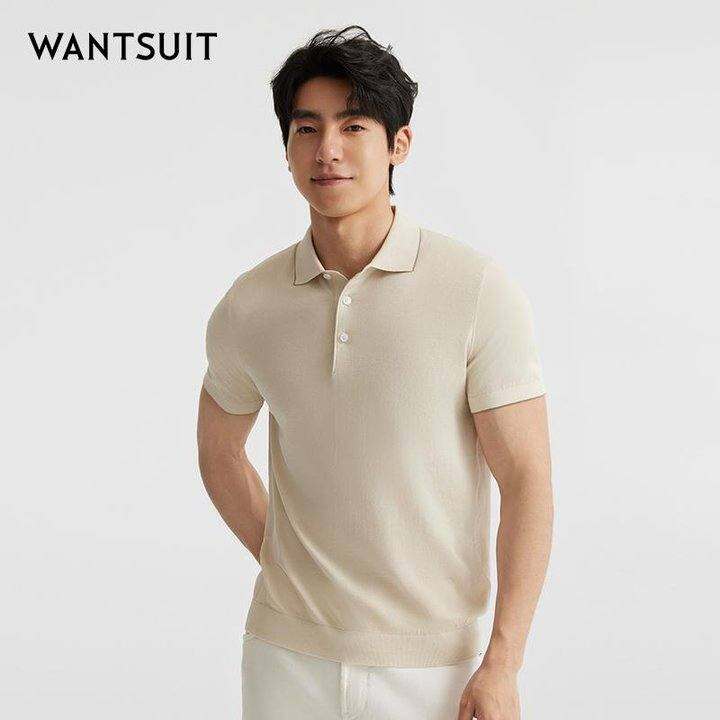 WANTSUIT米色净面翻领T恤J7500TX102D1