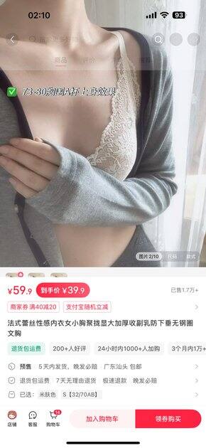 首先,这是一件适合小胸(真小胸,前后翻面基本没区别那种)的基础简约白色文胸其次,它的蕾丝边不廉价,我个人是比较挑质感的,蕾丝自然的过度到胸带上,如果穿v领,自然而然的露出一点蕾丝,小性感~另外,从舒适感上来说,一般偏上,它的杯垫不算厚,承托出来跟图片效果差不多,不是硬挤的那种美感。 ...