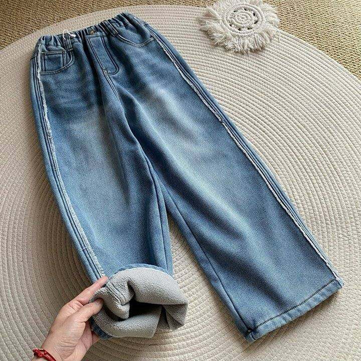 120-170码 侧毛边设计~加绒软牛仔阔腿裤 秋冬女童长裤k舒适