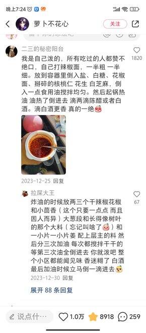 今天中午按这条评论里的做法做了辣椒油,真的太香了,香迷糊了,比买的所有辣椒油都好吃,蘸着馒头吃都特别满足。这俩人的做法相结合,油要用菜籽油