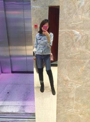 牛仔短外套+紧身牛仔裤+5050 内搭是裸色的优衣库的小高领坑条针织 包包是furla 其实牛仔单品真的很万能啊 适合这个天气 挡风又不过时
