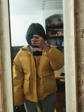 团的…颜色比较亮眼,穿起来真的好暖和,试了一下料子真的防水额。整体来说版型还好吧,比较学生气适合装嫩。155/110买的xs差不多刚好吧。冬天黄色比较亮眼