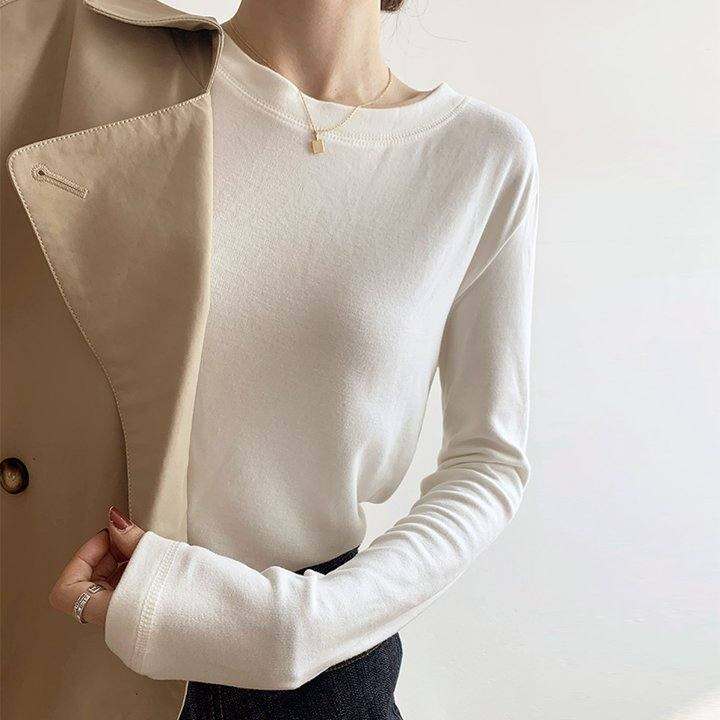 简约正肩白色打底衫女内搭德绒西装加绒春秋装冬季长袖t恤女上衣