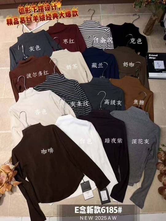 E念6185t恤女半高领打底衫女内搭修身秋长袖新款褶皱不规则上衣女
