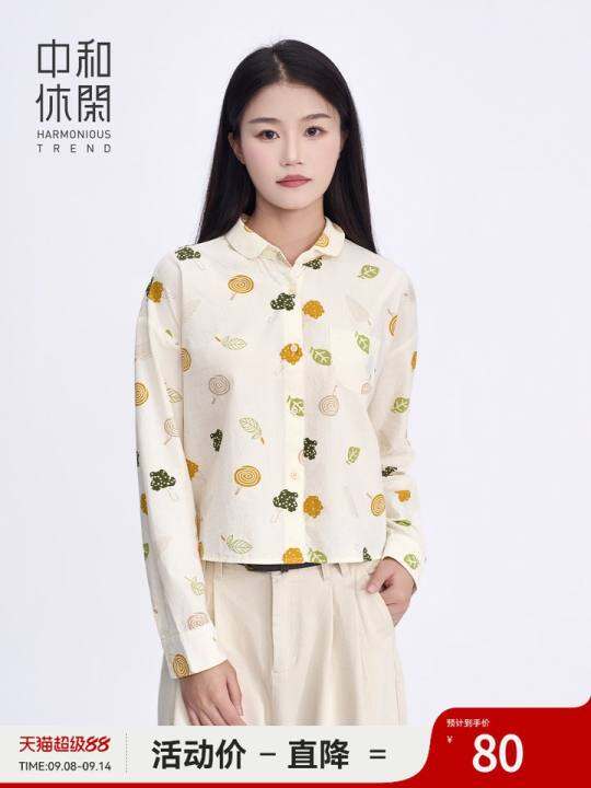 中和休闲印花长袖衬衫女2025秋季新款文艺小清新宽松休闲百搭衬衣