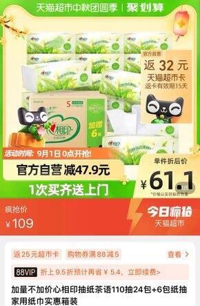 0点,猫超 | 抽纸,心相印0.54/包;立体美0.95/包