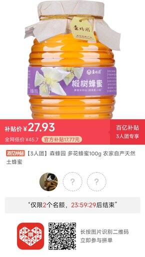 买的椴树蜂蜜 看之前别的姐妹发种草的 也是个老牌子了 淘宝c店55一瓶 pdd旗舰店拼单才30 为了阳了之后喝蜂蜜柠檬水备的