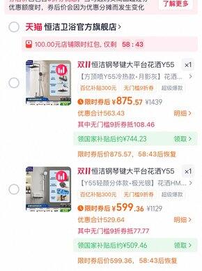 Y55 方顶喷,一共四个出水口[百亿补贴]恒洁钢琴按键花洒套装淋浴器3$CsHqf8AfpcG$:// CA1371进去弹 100 限时虹包,从淘金币页面加购分体款国补后只要 509.5,带大顶喷的 744拍 Y55 冷热款还有平台礼金,最后 579 拿下,太划算了群友反馈弹礼金了,现在拍下更便宜