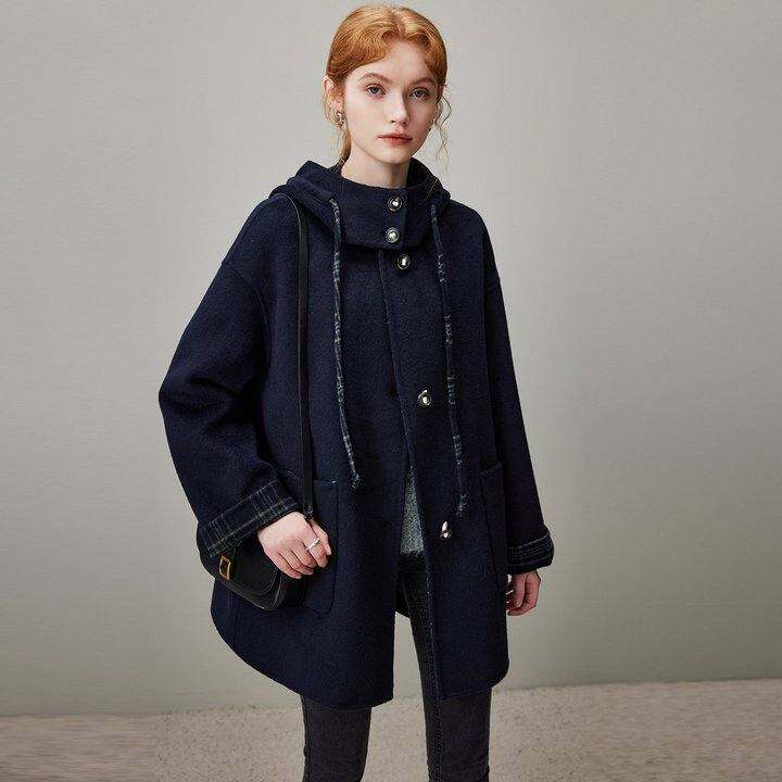 dfvc韩版中长款羊毛呢外套女2025年冬季新款连帽宽松双面呢子大衣