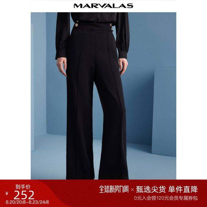 曼德诗黑色高腰休闲裤2023夏新款纯色纽扣阔腿裤通勤显瘦直筒长裤